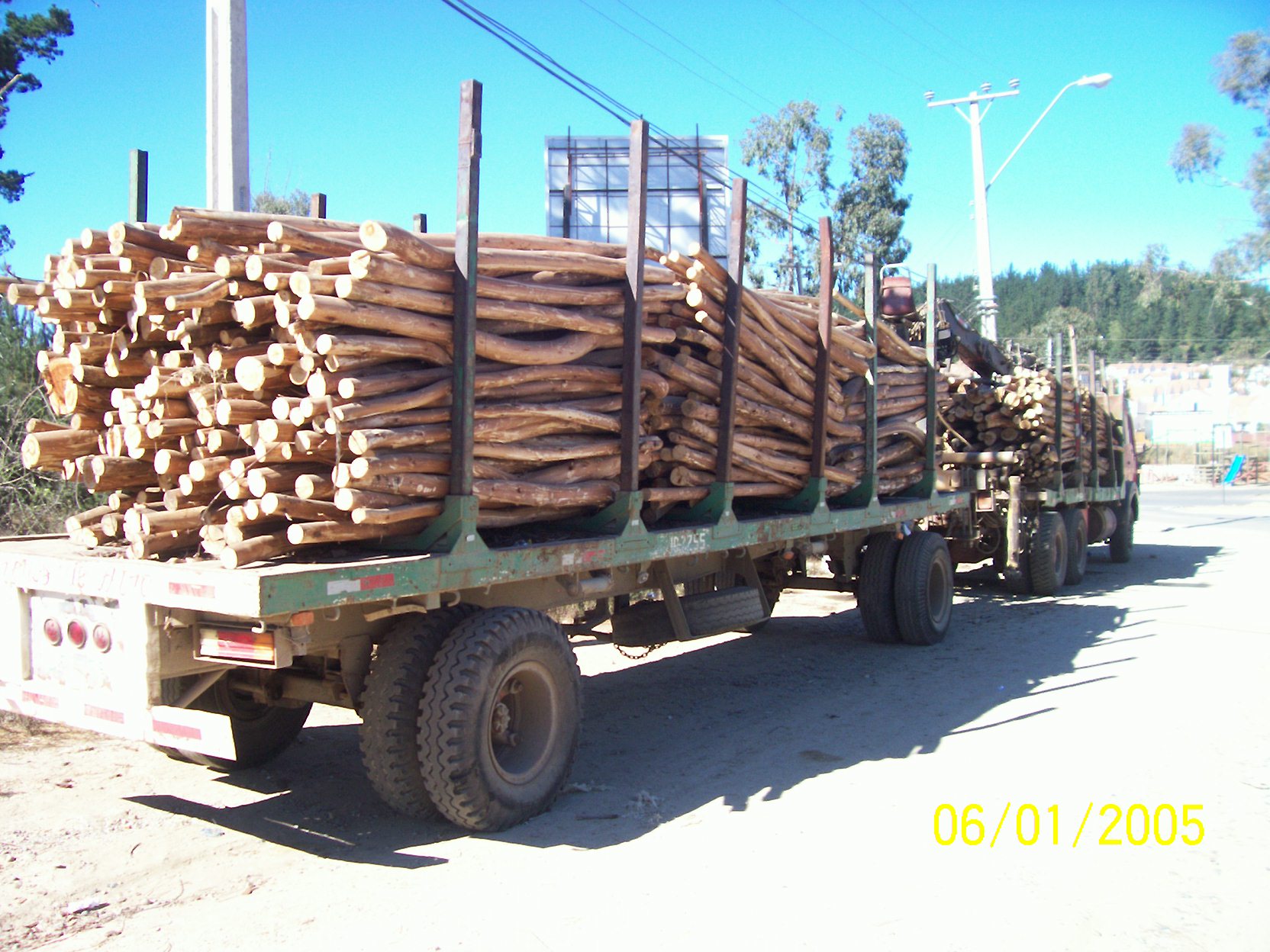 La madera es obtenida en forma sustentable de los bosques cultivados del país y trasladados en camiones a la fábrica de celulosa.
